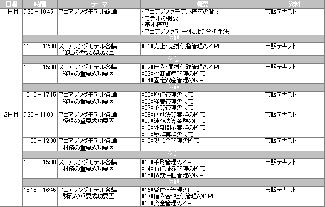 基礎コース(2日間)では、経理財務の初心者の方も、管理職の方も、日常の業務全体を概観しながら、ご自分が経験のない他の業務についても、経理業務の効率化と品質の向上のために重要なチェックポイントを網羅的に学習できます。 併せて、スコアリングモデルの評価対象となる経理財務業務の重要成功要因(CF)、評価指標(KPI)を解説します。